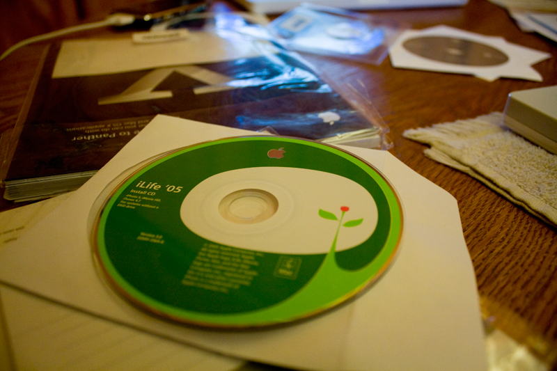 Dusting off the envelope which held all the original info that came with the machine, it was great to see how much Apple’s packaging has changed in just a few years. A huge Panther user guide, nicely designed iLife disc’s and some of the big Apple stickers you used to get. They seem to have shrunk them over the recent years, apparently. That is, if they’re even still bundled with things.