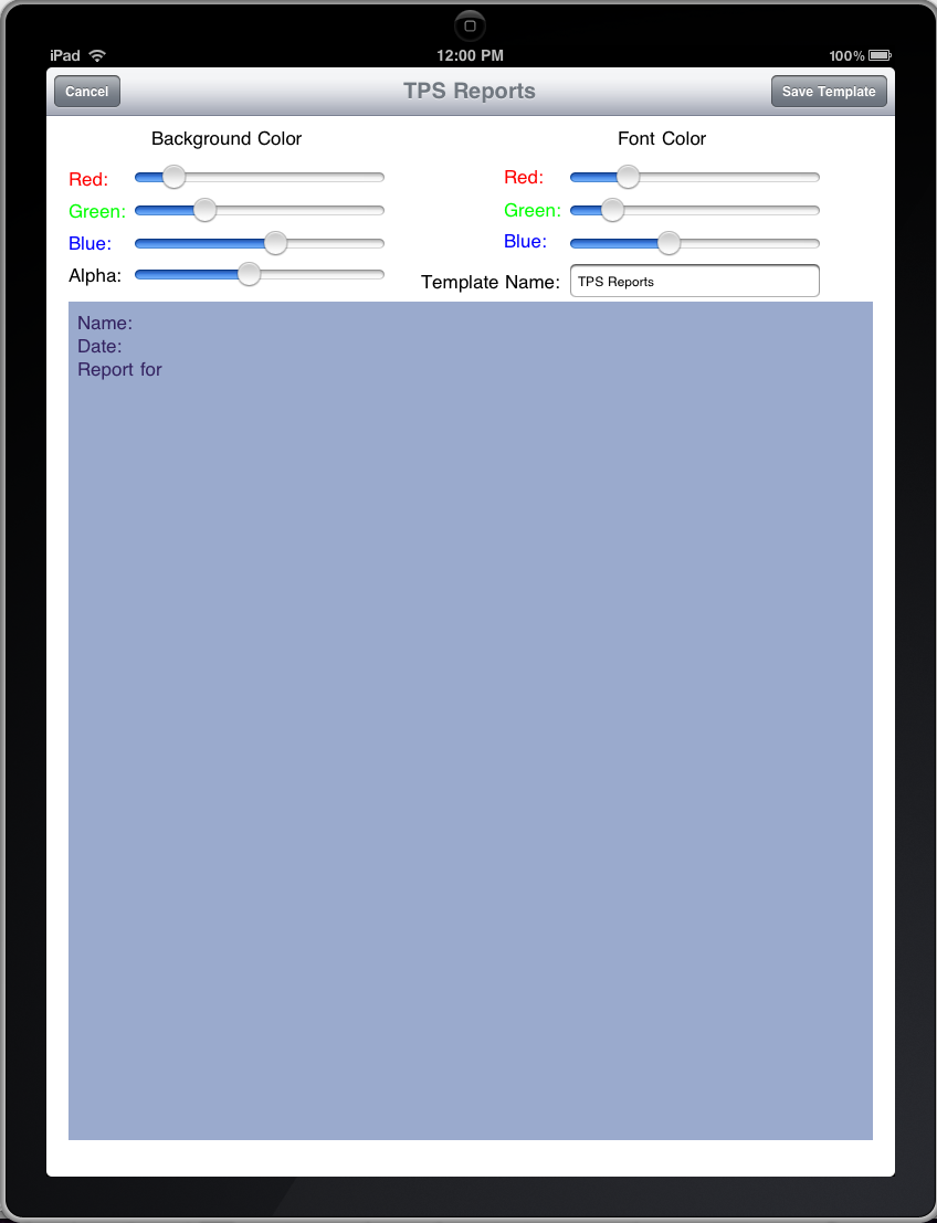 When I asked Wayne why he decide to make this app, he said “I write a daily blog post, I use the same template day after day after day, so I decided to write an app to handle templates.” I would have to agree with him. With this app you can create some great templates. You can create multiple templates, and then save them for later use. When you want to create a new document you are asked if you want a “New Blank File”, or “New From Template”. When you choose “New From Template” you will be taken to a screen with your saved templates.