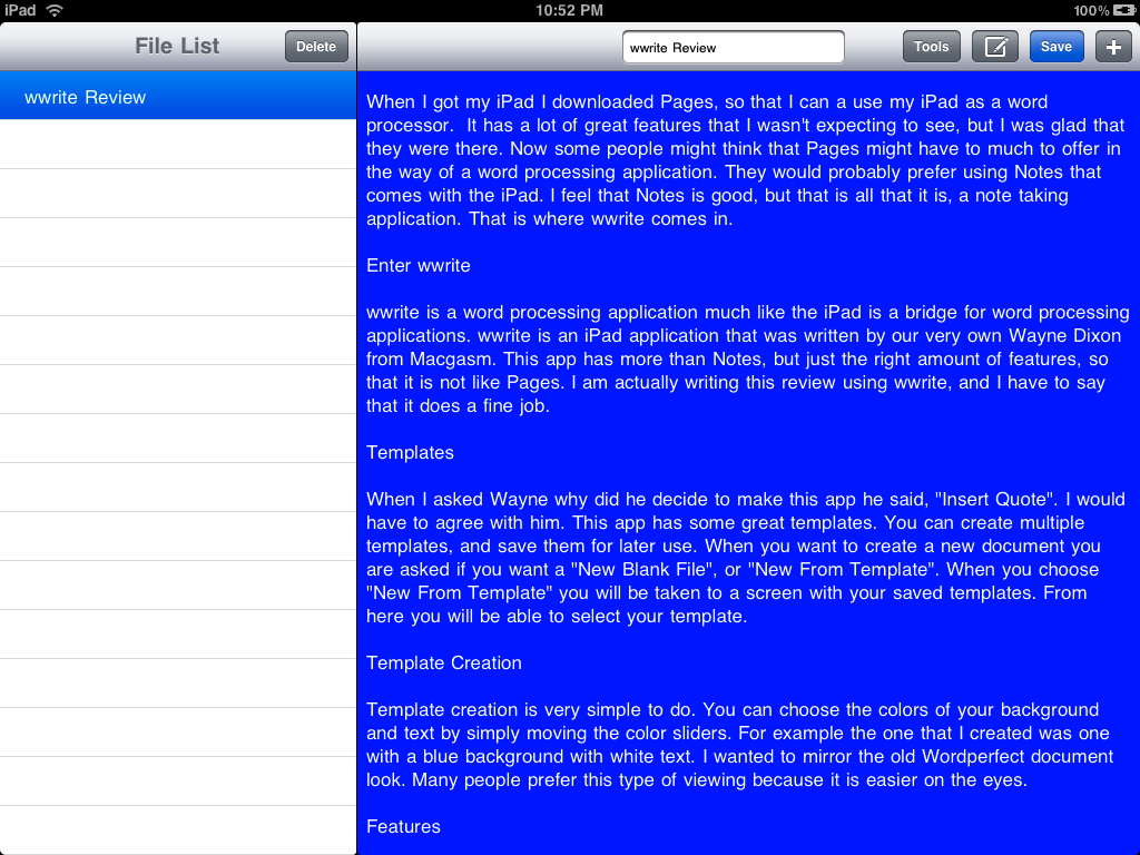 When I got my iPad I downloaded Pages, so that I can a use my iPad as a word processor. It has a lot of great features that I wasn’t expecting to see, but I was glad that they were there. Now, some people might think that Pages is too much word processor for their needs. They would probably prefer using the notes app that comes with the iPad. That’s fine, but there is a gap between the two apps. That is where wwrite comes in.